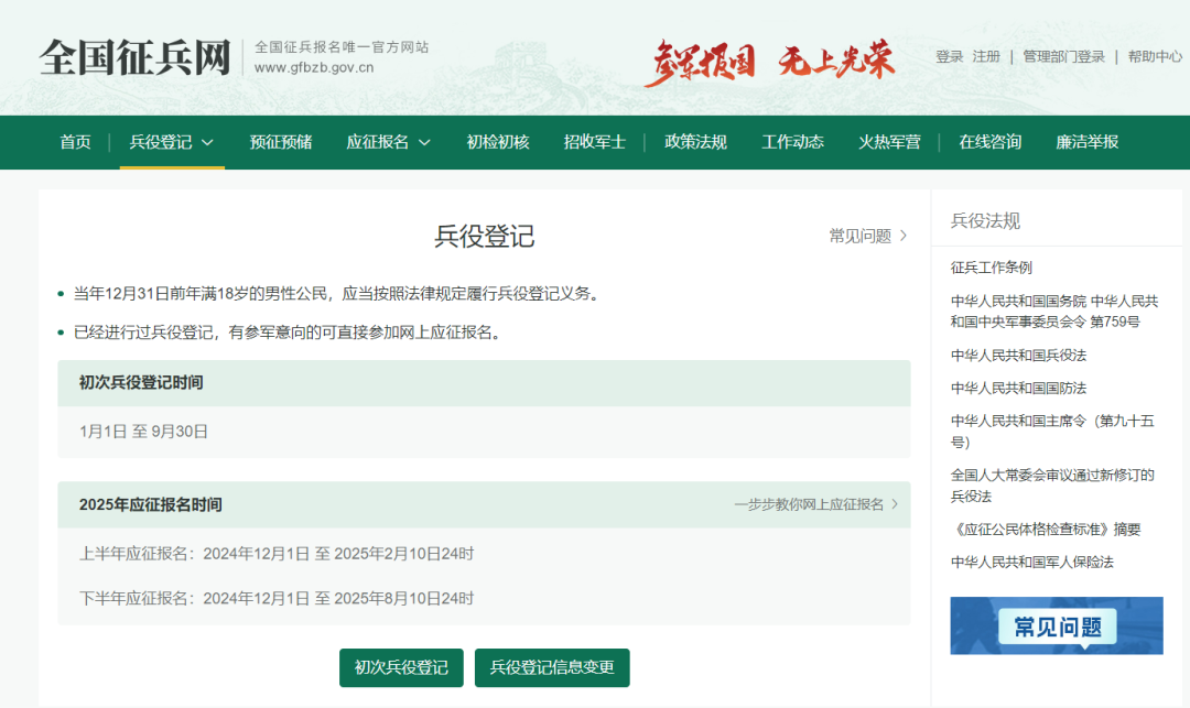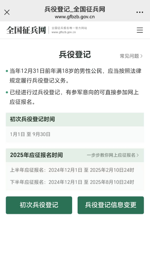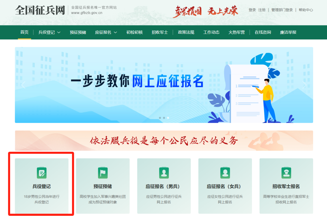 2.直接用电脑登录“全国征兵网”(网址:https://www.gfbzb.gov.cn/),找到“兵役登记”入口,进行兵役登记。