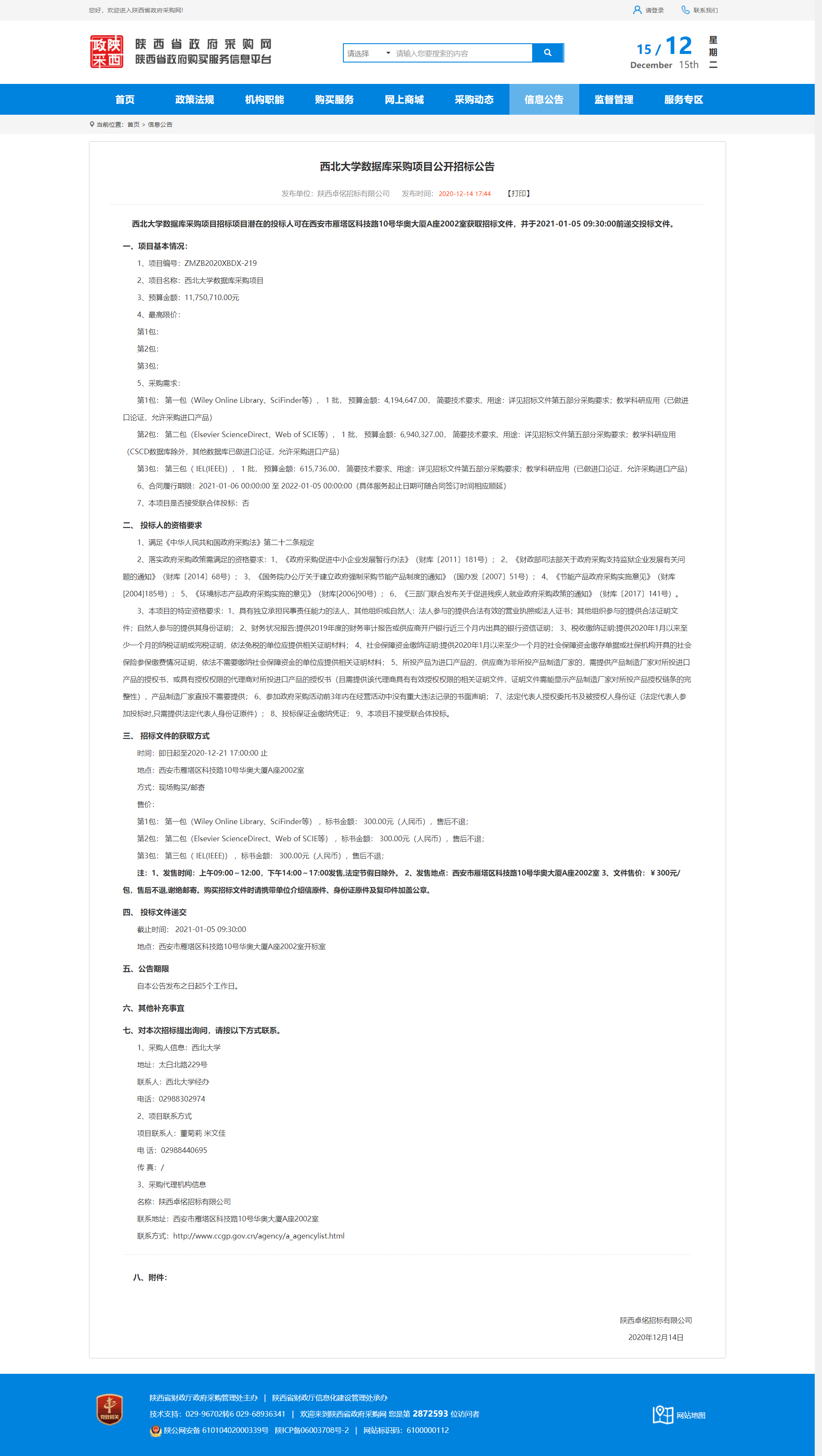 米兰网页版·官方端在线数据库采购项目公开招标公告 作者: 编辑:薛利娟 时间:2020-12-15 原公告地址:http://www.ccgp-shaanxi.gov.cn/notice/noticeDetail.do?noticeguid=8a85be32765f9c9b0176607804921682