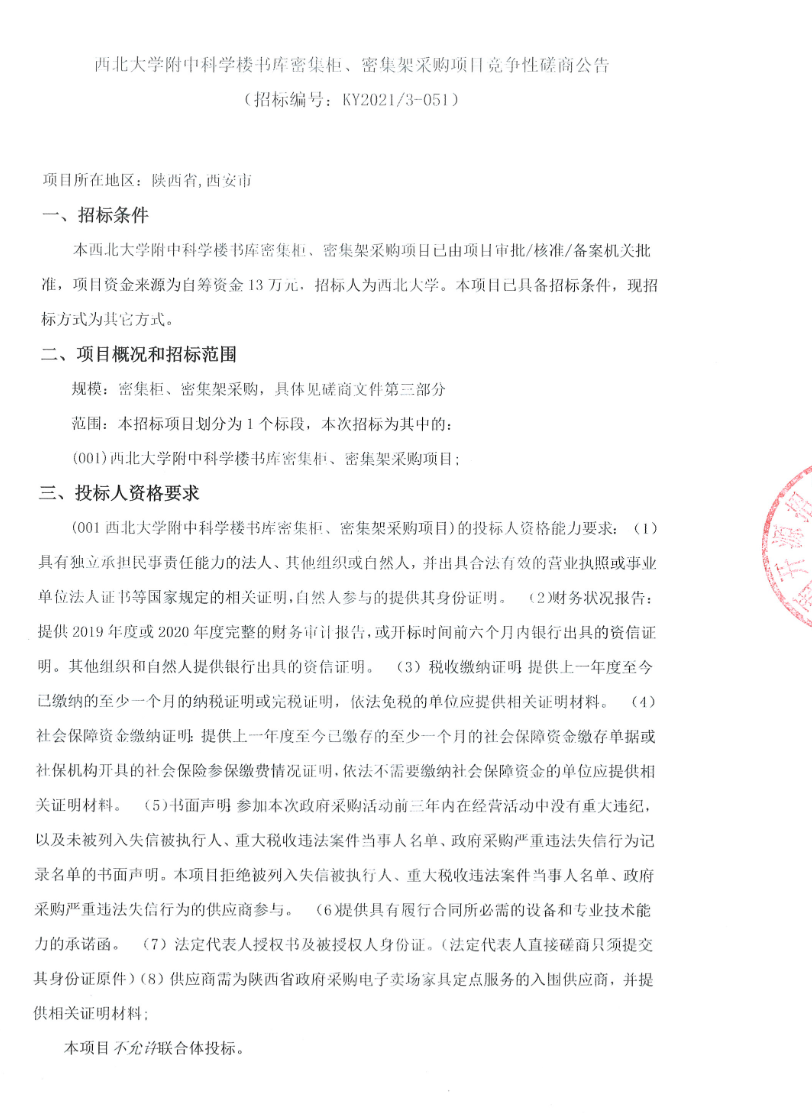 米兰网页版·官方端在线附中科学楼书库密集柜、密集架采购项目竞争性磋商公告