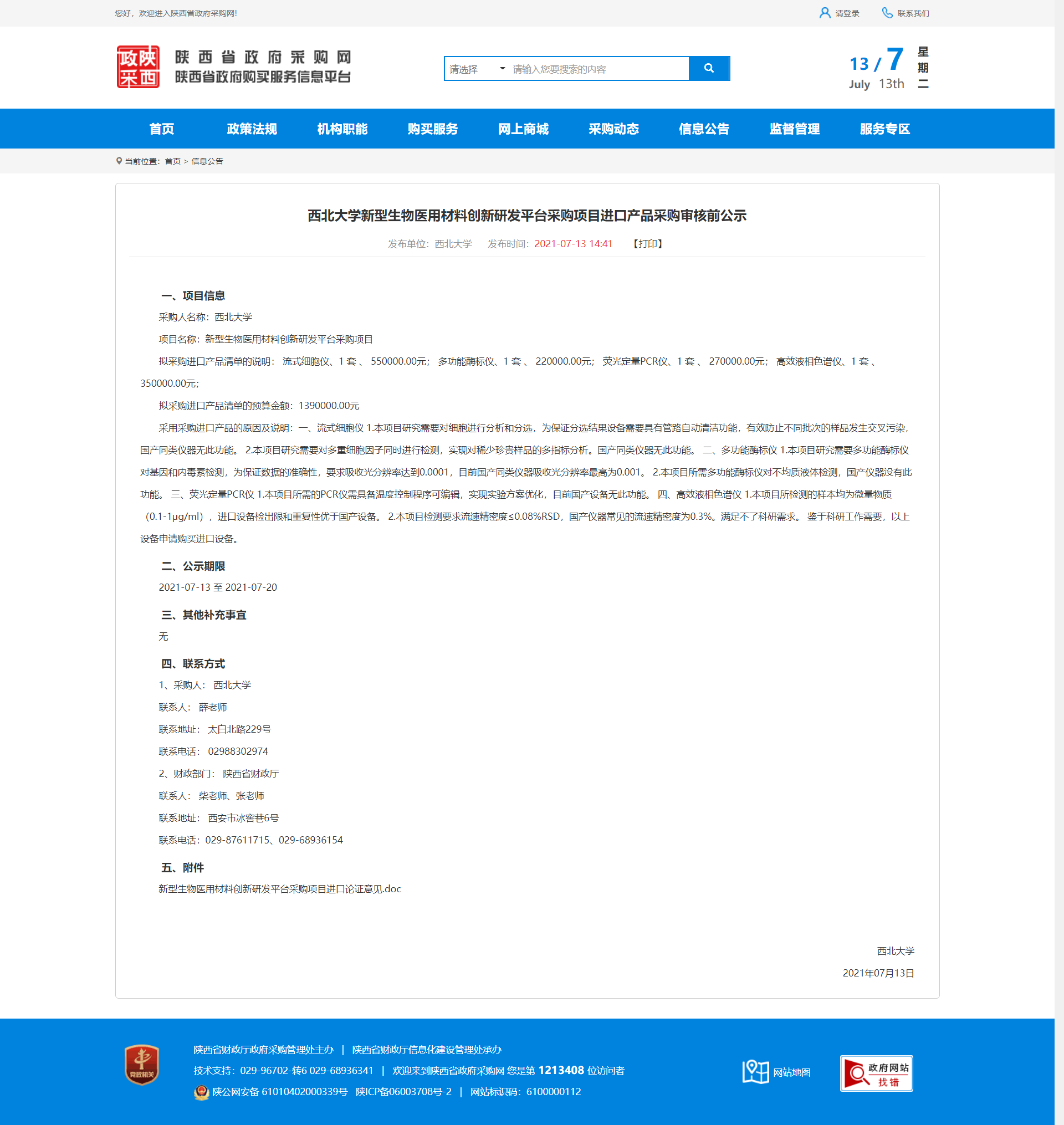 米兰网页版·官方端在线新型生物医用材料创新研发平台采购项目进口产品采购审核前公示 作者: 编辑:采购与招标办公室 时间:2021-07-13 原公示地址:http://www.ccgp-shaanxi.gov.cn/notice/noticeDetail.do?noticeguid=8a85be317a79693c017a9e7fb1b57286
