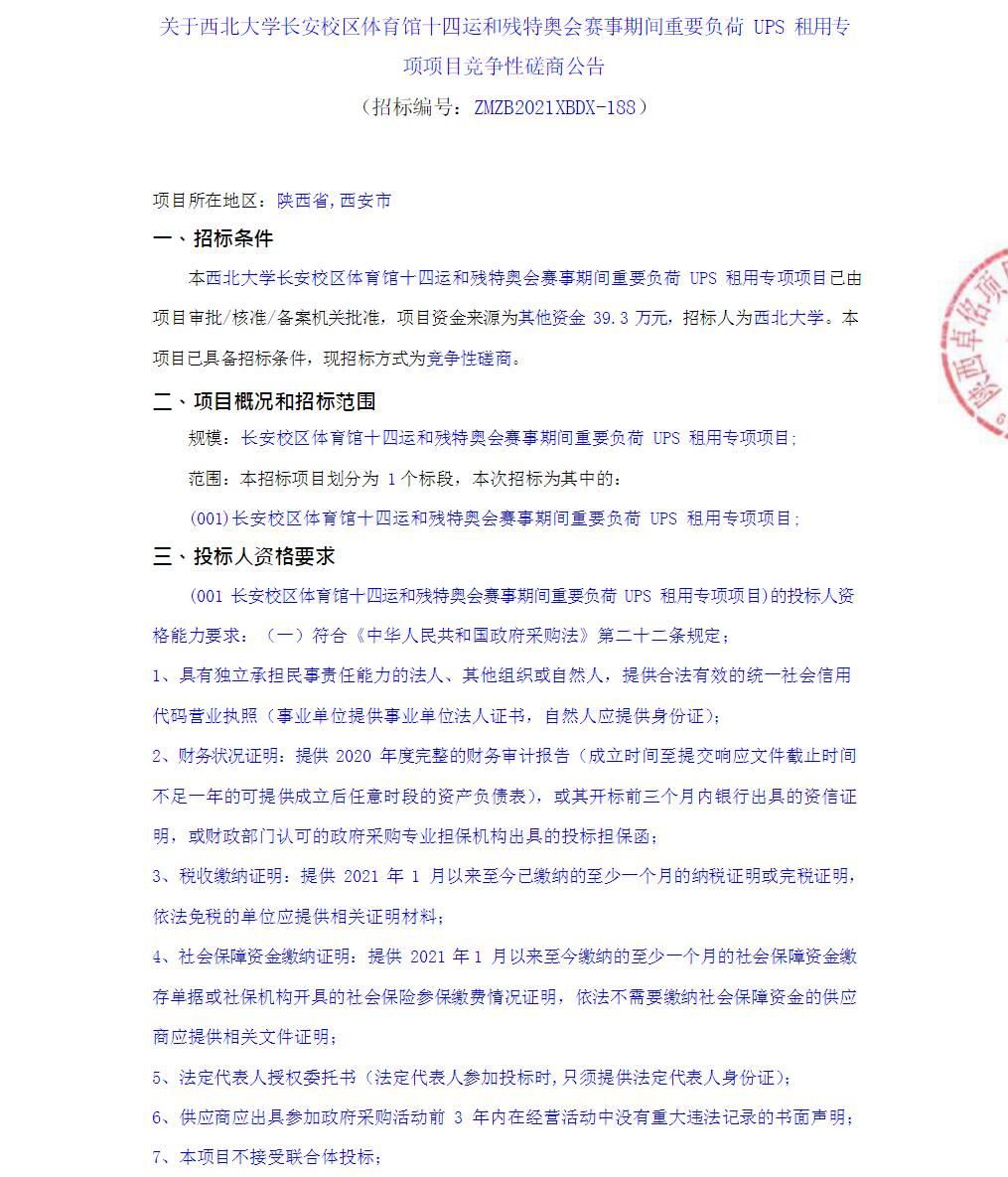 关于米兰网页版·官方端在线长安校区体育馆十四运和残特奥会赛事期间重要负荷UPS租用专项项目竞争性磋商公告