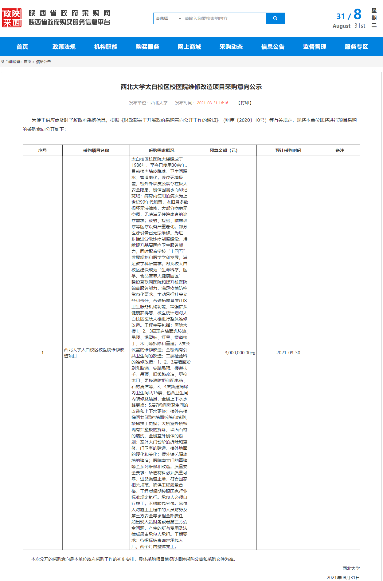 米兰网页版·官方端在线太白校区校医院维修改造项目采购意向公示