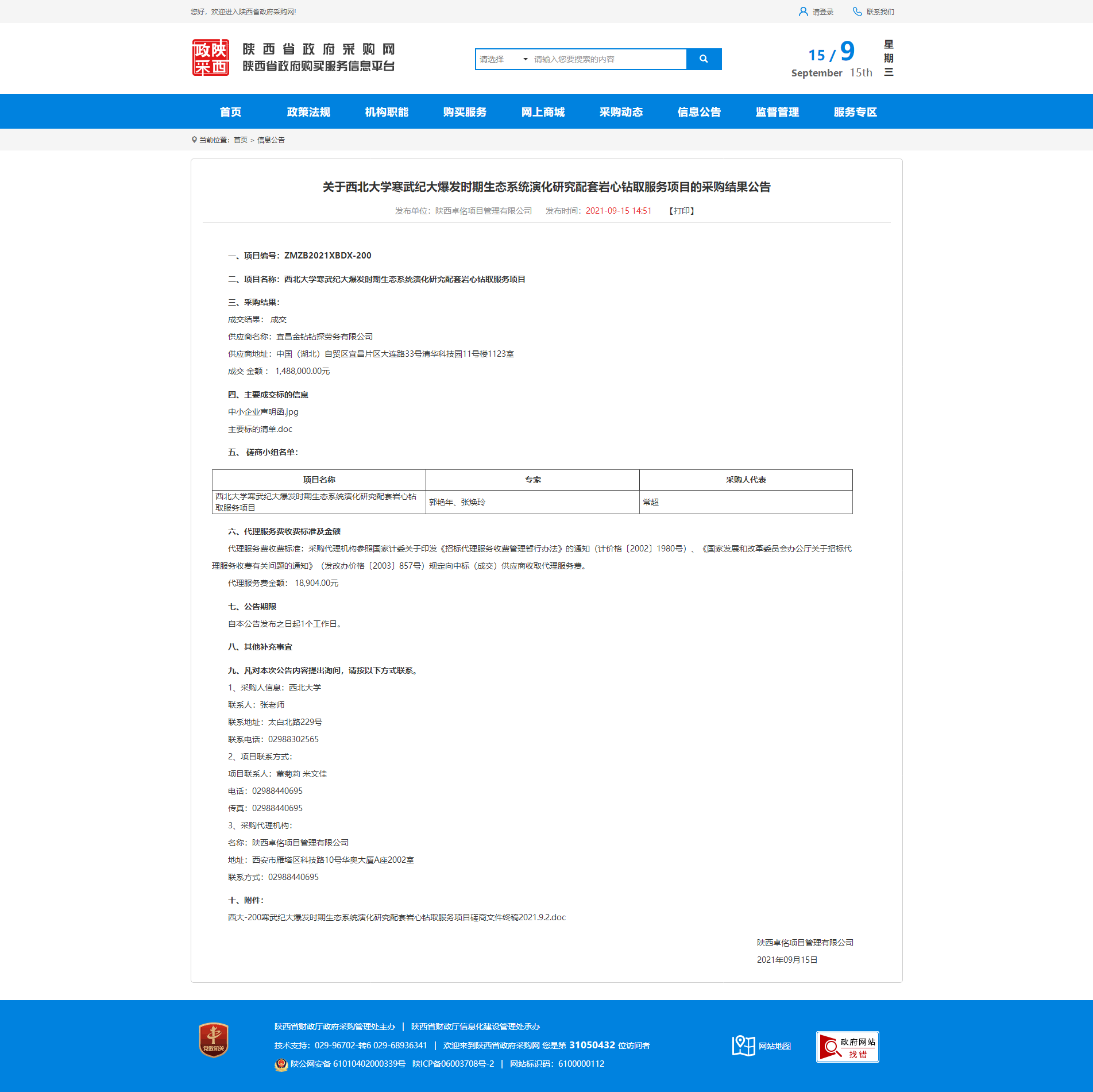关于米兰网页版·官方端在线寒武纪大爆发时期生态系统演化研究配套岩心钻取服务项目的采购结果公告