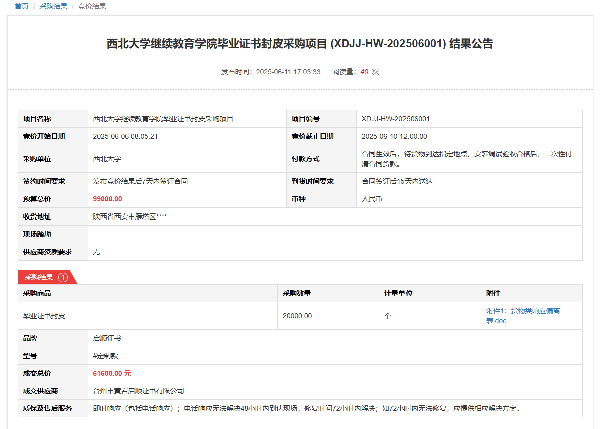 米兰网页版·官方端在线继续教育学院毕业证书封皮采购项目(XDJJ-HW-202506001)竞价结果公告 作者:采购与招标办公室 编辑: 时间:2025-06-12 原公告链接:https://www.ejingcai.com.cn/site/bidding/detail/18846