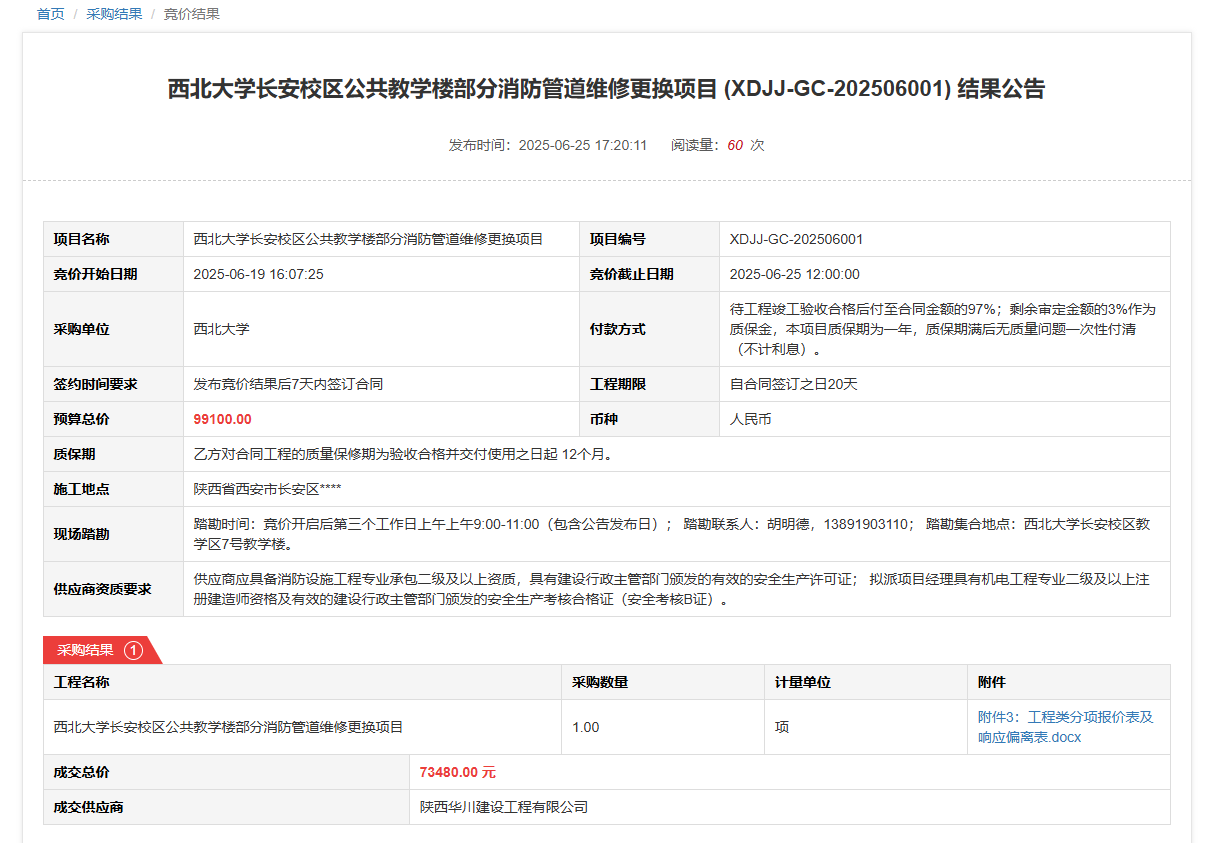 米兰网页版·官方端在线长安校区公共教学楼部分消防管道维修更换项目(XDJJ-GC-202506001)竞价结果公告 作者:采购与招标办公室 编辑: 时间:2025-06-25 原公告链接:https://www.ejingcai.com.cn/site/bidding/detail/19191