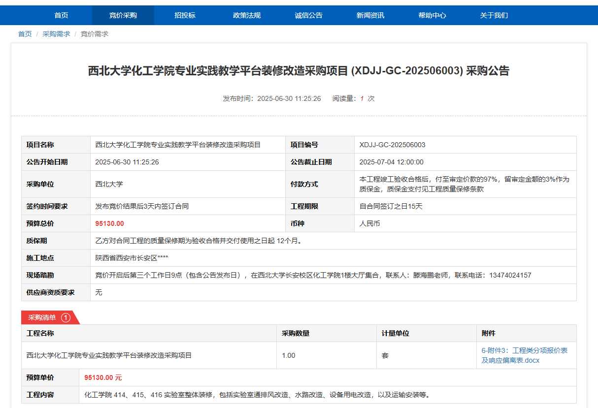 米兰网页版·官方端在线化工学院专业实践教学平台装修改造采购项目(XDJJ-GC-202506003)竞价采购公告 作者:采购与招标办公室 编辑: 时间:2025-06-30 原公告链接:https://www.ejingcai.com.cn/site/bidding/detail/19244