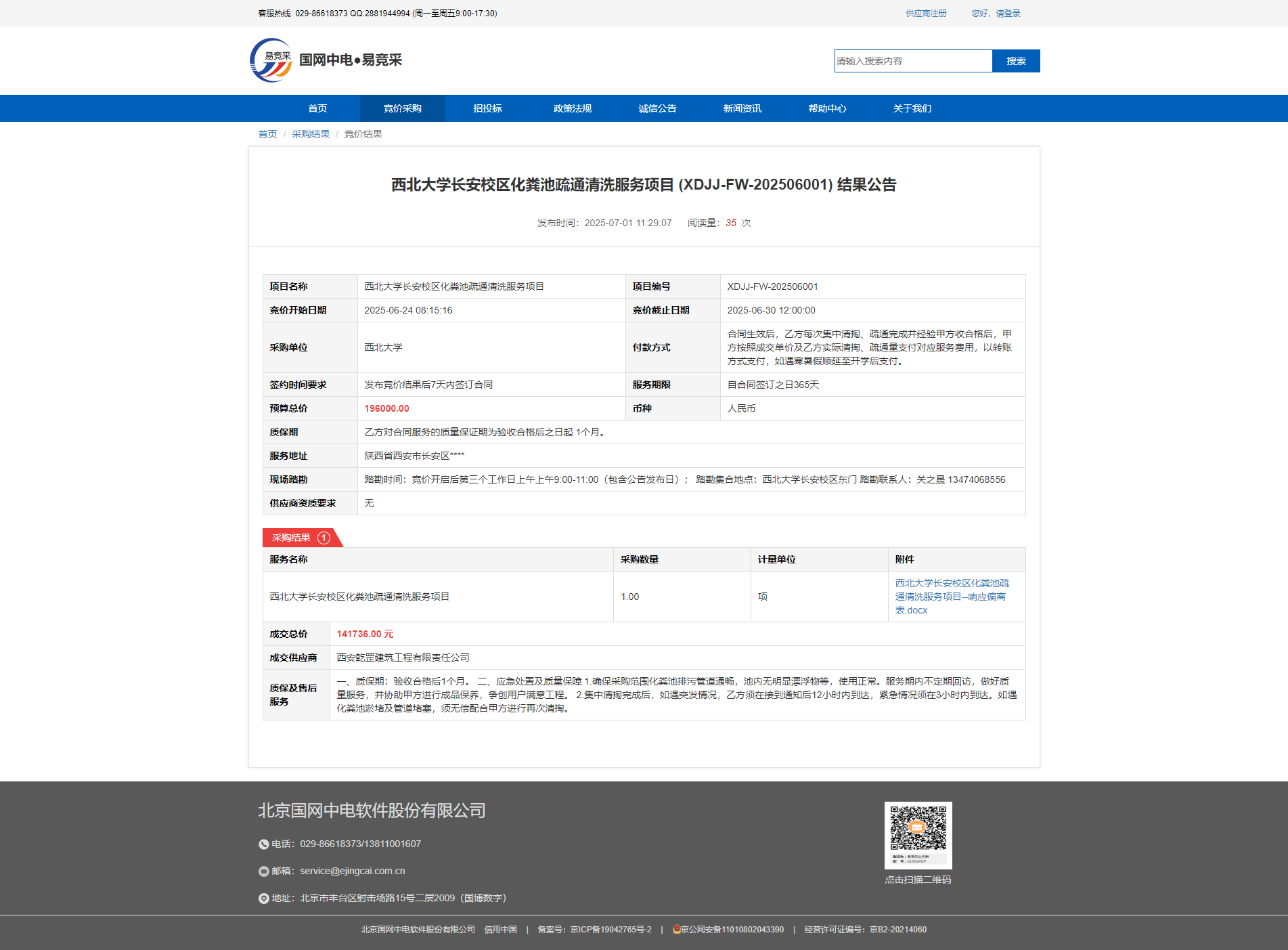米兰网页版·官方端在线长安校区化粪池疏通清洗服务项目 (XDJJ-FW-202506001) 结果公告