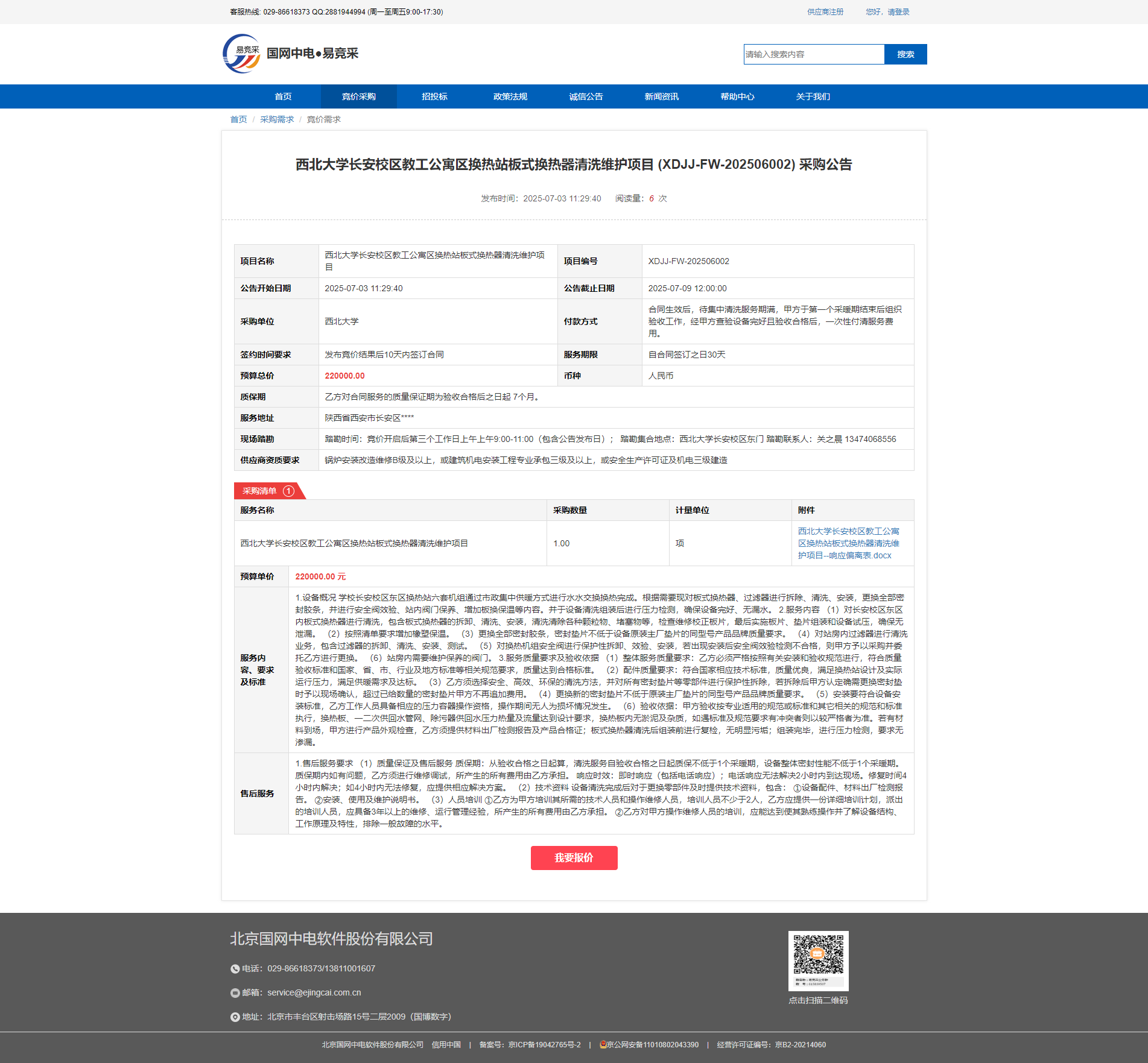 米兰网页版·官方端在线长安校区教工公寓区换热站板式换热器清洗维护项目 (XDJJ-FW-202506002) 采购公告