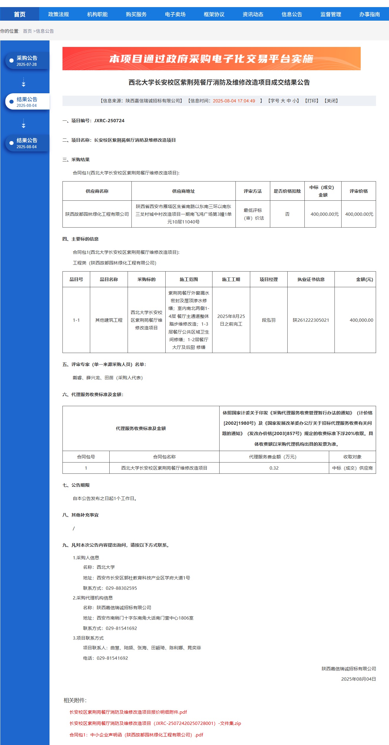 米兰网页版·官方端在线长安校区紫荆苑餐厅消防及维修改造项目成交结果公告 作者: 编辑:党丹珩 时间:2025-08-04 公告地址:http://www.ccgp-shaanxi.gov.cn/freecms/site/shaanxi/ggxx/info/2025/8a69c4d59860f6420198744983276ed2.html?noticeType=001023¬iceId=1f58d820-7114-11f0-8063-08c0eb20c666