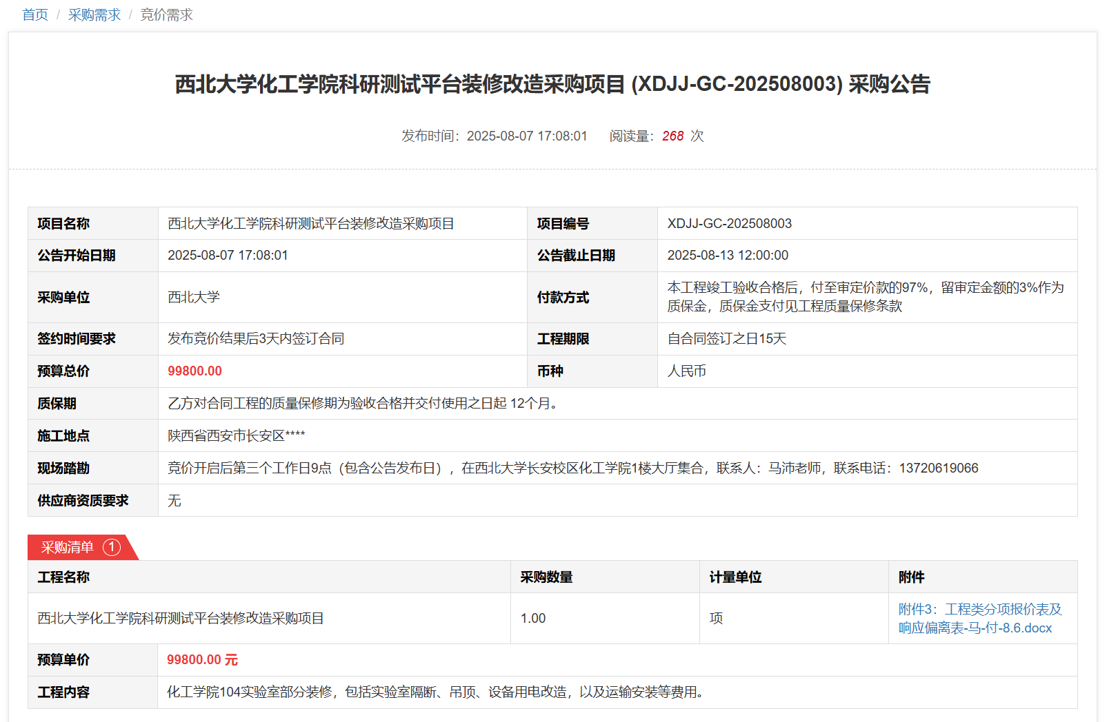 米兰网页版·官方端在线化工学院科研测试平台装修改造采购项目(XDJJ-GC-202508003)竞价采购公告