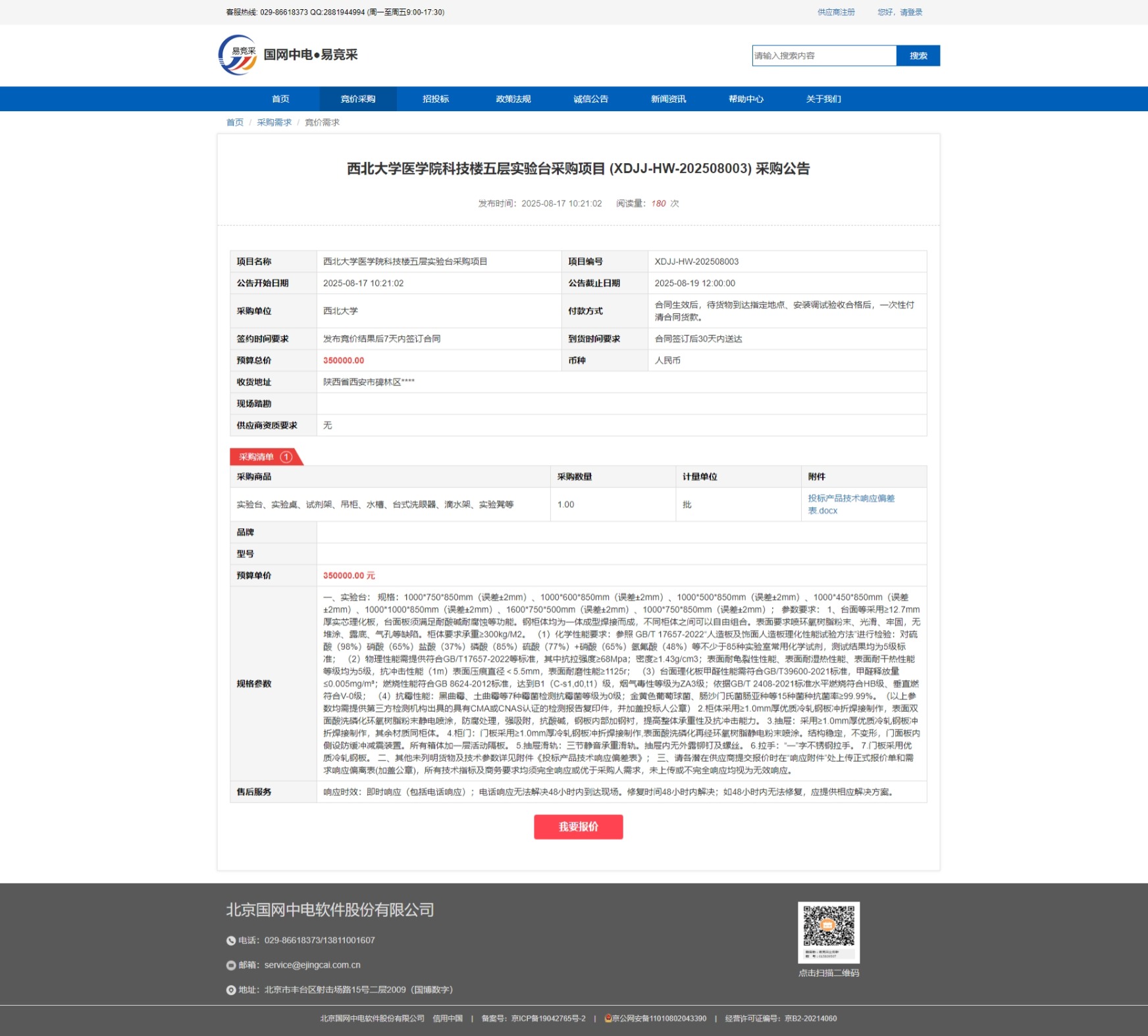 米兰网页版·官方端在线医学院科技楼五层实验台采购项目 (XDJJ-HW-202508003)竞价 采购公告
