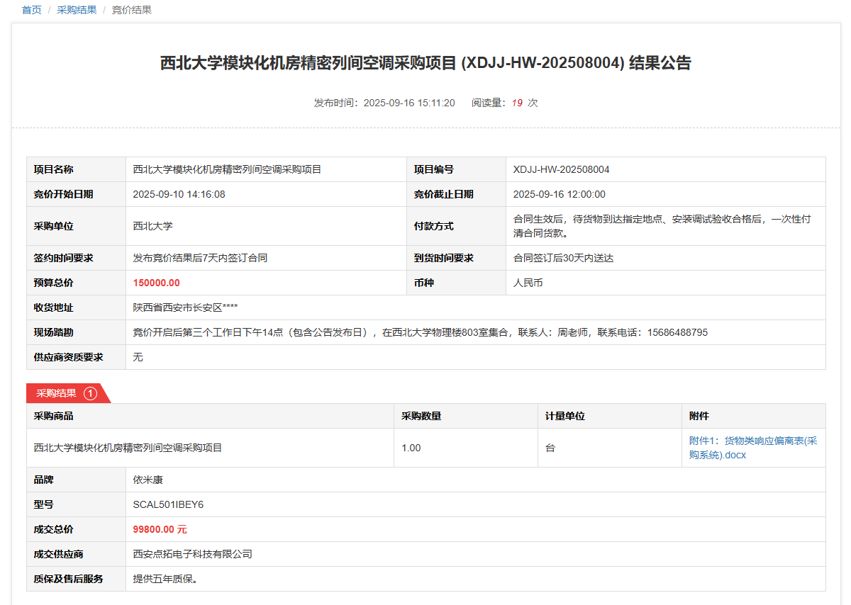 米兰网页版·官方端在线模块化机房精密列间空调采购项目(XDJJ-HW-202508004)竞价结果公告
