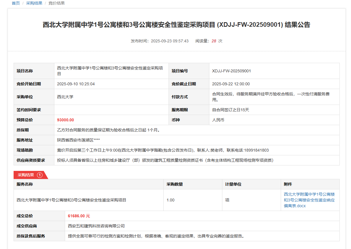 米兰网页版·官方端在线附属中学1号公寓楼和3号公寓楼安全性鉴定采购项目(XDJJ-FW-202509001)竞价结果公告
