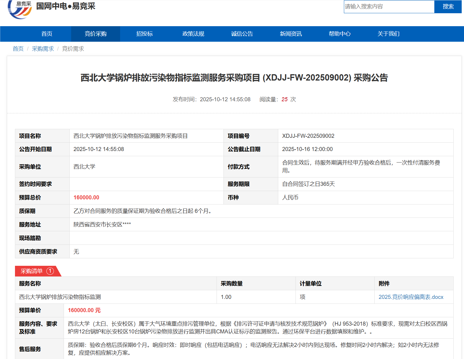 米兰网页版·官方端在线锅炉排放污染物指标监测服务采购项目(XDJJ-FW-202509002)竞价采购公告