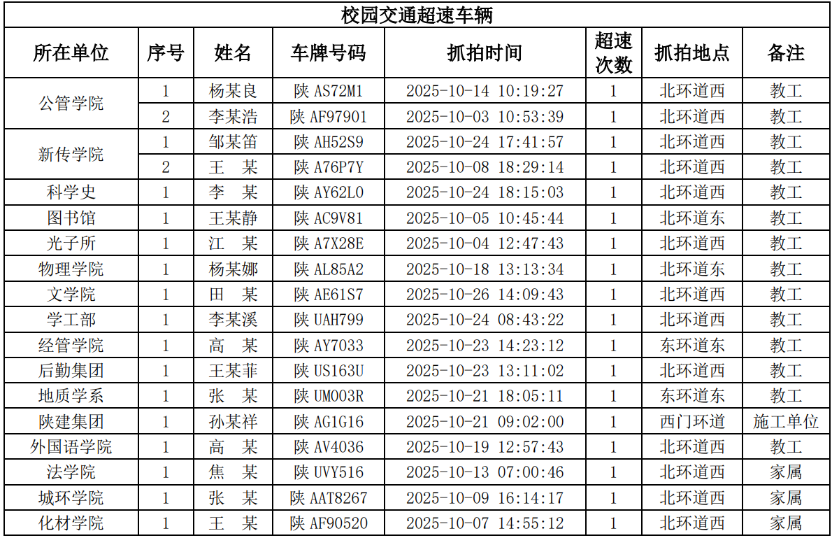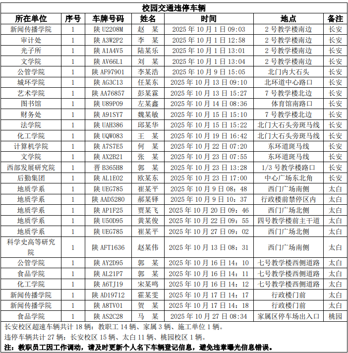为进一步加强校园交通管理,保障校园交通安全有序,维护学校正常的教学、科研和生活秩序,切实保护师生员工的人身财产安全,根据《米兰网页版·官方端在线校园交通安全管理规定》的相关要求,现将2025年10月校园交通违章车辆予以曝光,具体要求与违章信息如下: