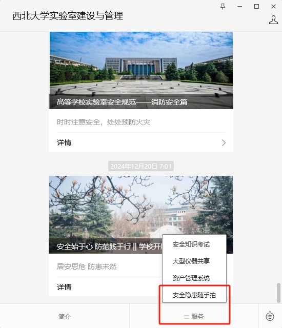(1)关注“米兰网页版·官方端在线实验室建设与管理”微信公众号,选择“服务”—“安全隐患随手拍”,填写个人信息、隐患描述等,并上传隐患照片。