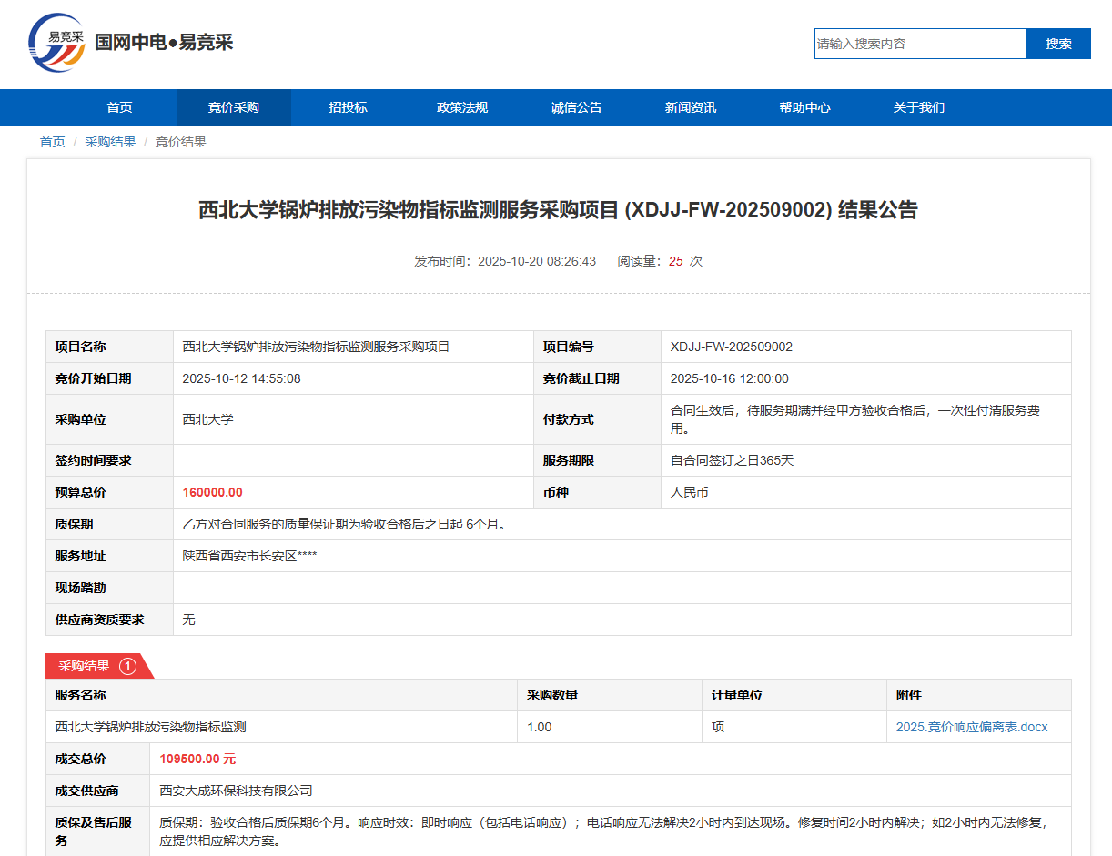 米兰网页版·官方端在线锅炉排放污染物指标监测服务采购项目(XDJJ-FW-202509002)竞价结果公告