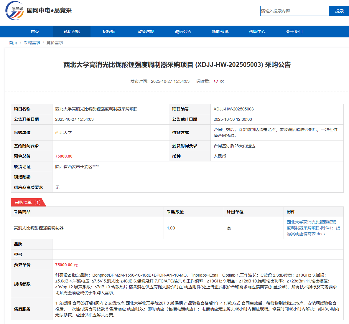 米兰网页版·官方端在线高消光比铌酸锂强度调制器采购项目(XDJJ-HW-202505003)竞价采购公告
