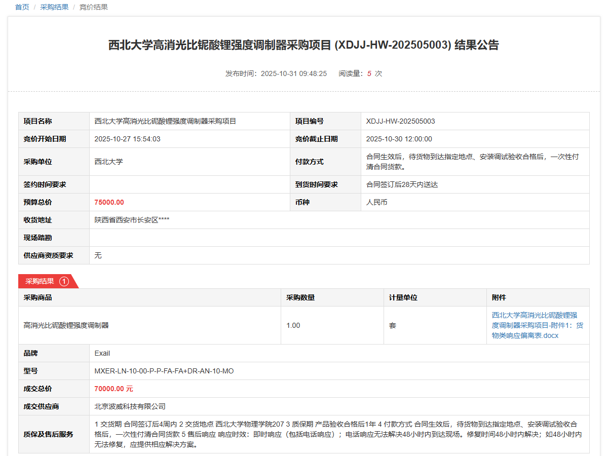 米兰网页版·官方端在线高消光比铌酸锂强度调制器采购项目(XDJJ-HW-202505003)竞价结果公告