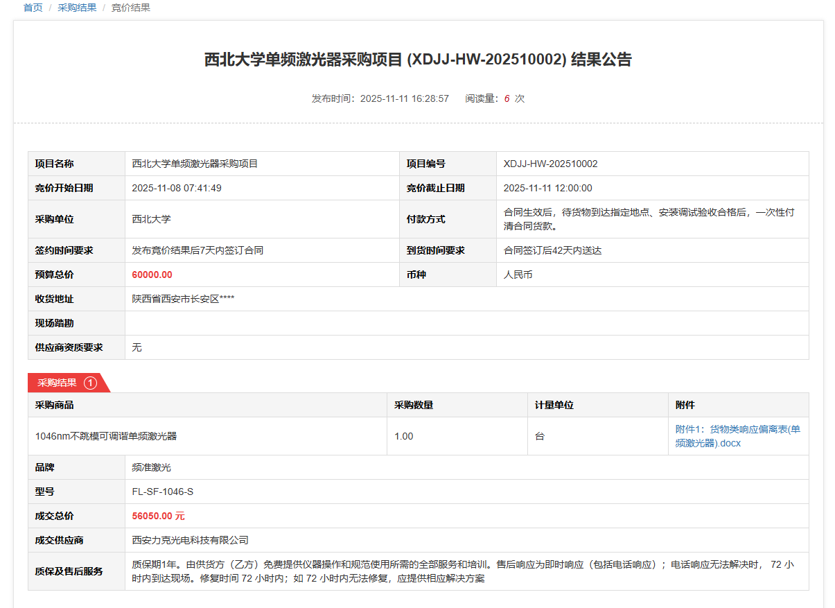 米兰网页版·官方端在线单频激光器采购项目(XDJJ-HW-202510002)竞价结果公告