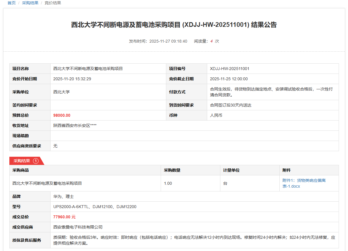 米兰网页版·官方端在线不间断电源及蓄电池采购项目(XDJJ-HW-202511001)竞价结果公告